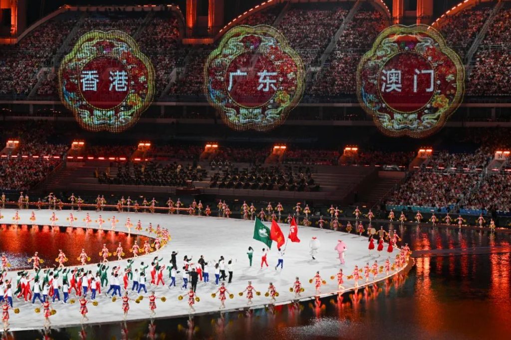 На фото: спортивные делегации хозяев — Гуандуна, Гонконга и Макао — одновременно выходят на стадион. Фото корреспондента CNS: Чэнь Цзиминь