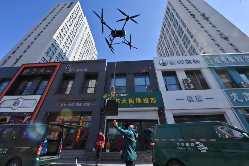 21 февраля, Чанчунь, провинция Цзилинь: дрон выполняет доставку посылок. В последнее время интеллектуальная логистика, основанная на «бесшовном соединении» дронов, беспилотных доставочных автомобилей и робопсов, начала функционировать на постоянной основе в зоне высоких технологий Цзинъюэ.