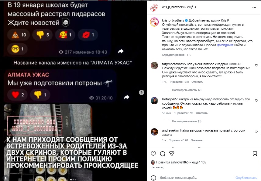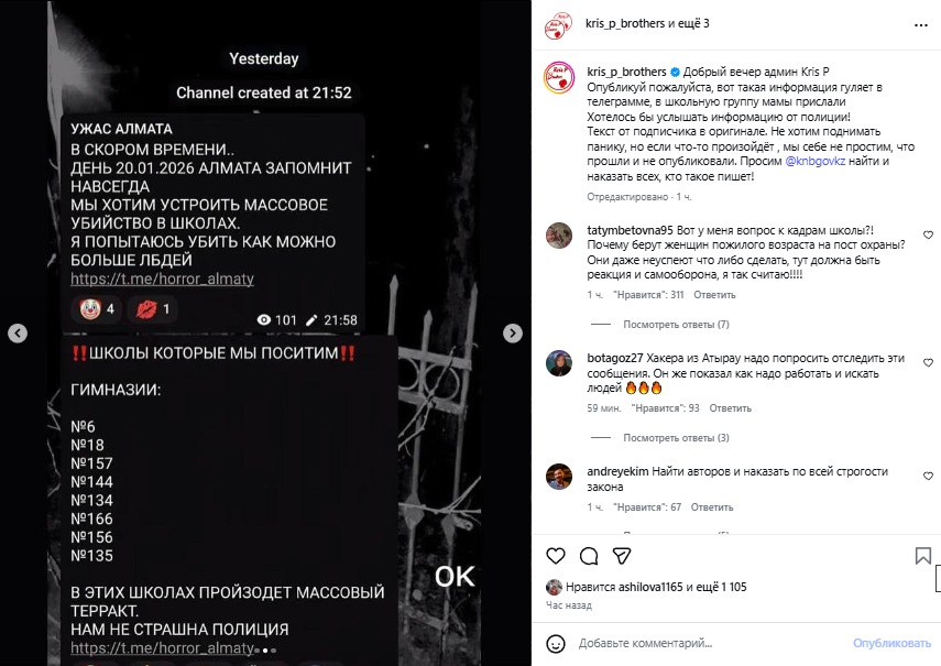 Популярный в Алматы инстаграм-аккаунт Kris_p_brothers выдал утром тревожную новость — 19-20 января в алматинских школах, возможно, готовятся теракты.