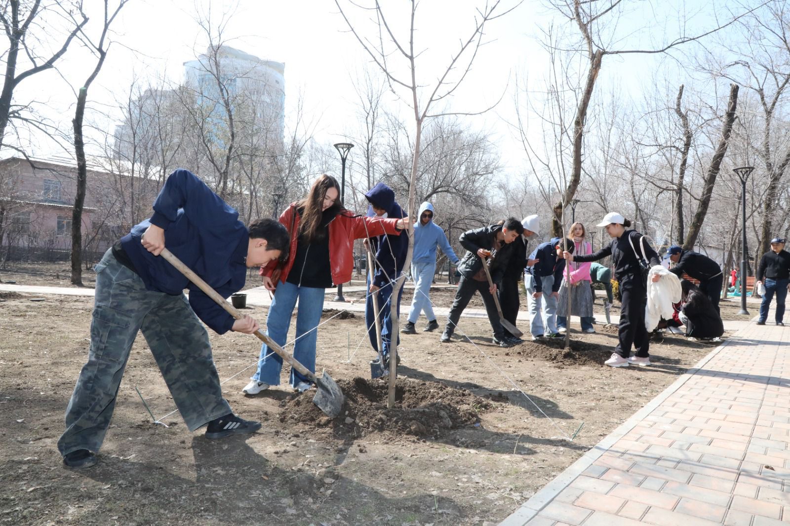 В районной акции приняло участие более ста человек — волонтеры, школьники, студенты и местные жители. Они объединились, чтобы внести свой вклад в озеленение города и сделать окружающую среду комфортнее. Одна из участниц мероприятия Ғалия Ермуханова указала на то, что важной частью работы является дальнейший уход за деревьями.
