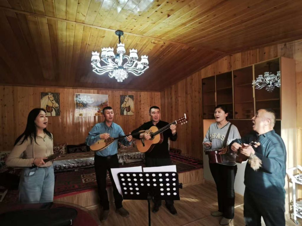 50-летний Ербол Харидан перебирает струны домбры, рядом спутники подключаются, играя на гитаре, ударяя в бубен и другие инструменты, мелодия льётся протяжно у подножия Тянь-Шаня, а собравшиеся жители деревни хлопают и одобряют.
