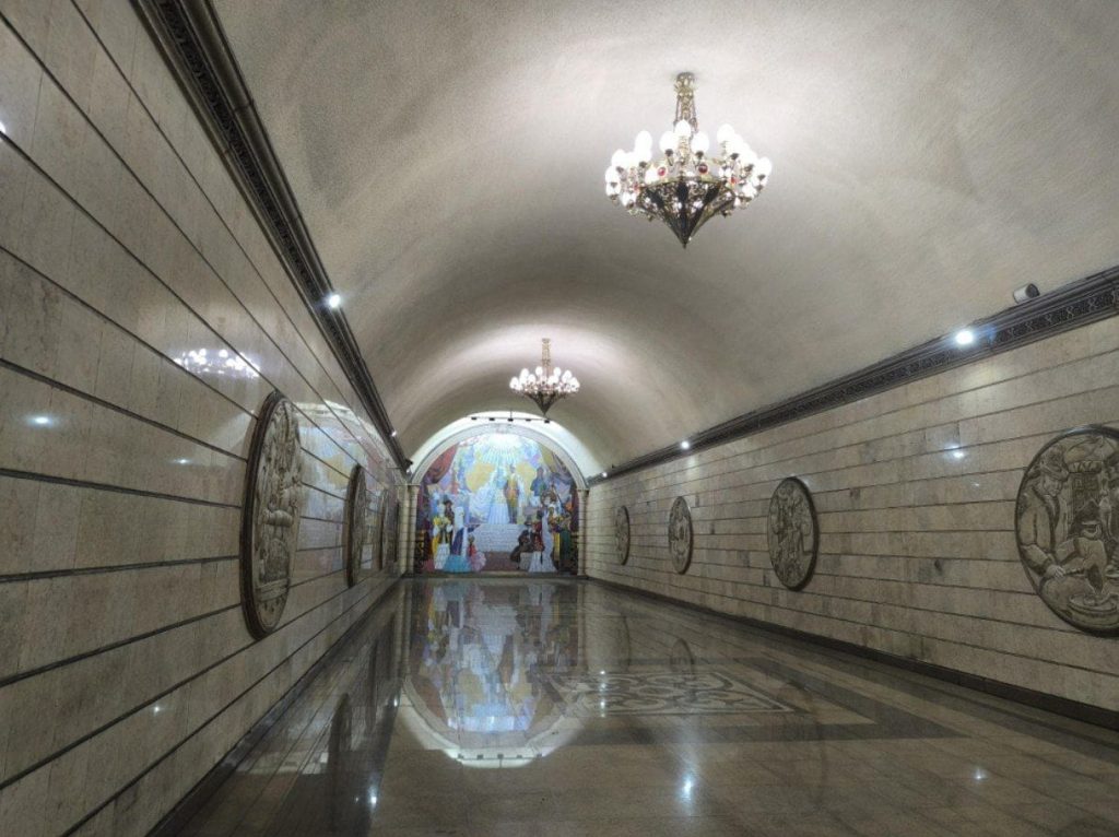 Станция «Театр имени Мухтара Ауэзова» » привлекает уютной атмосферой и художественными элементами на стенах, которые отражают местную культуру.