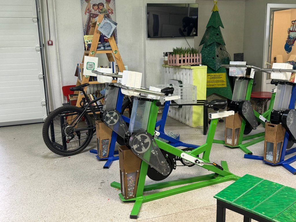Велошредер — это интерактивное устройство, совмещающее велосипед и измельчитель, которое позволяет превращать пластиковые отходы в крошку прямо во время езды.