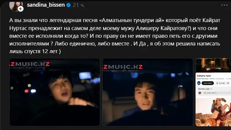 Популярная композиция «Алматының түндері ай» в исполнении Кайрата Нуртаса оказалась в центре обсуждений в соцсетях. Поводом стало заявление одной из пользовательниц Threads, которая утверждает, что настоящий автор песни — её супруг.