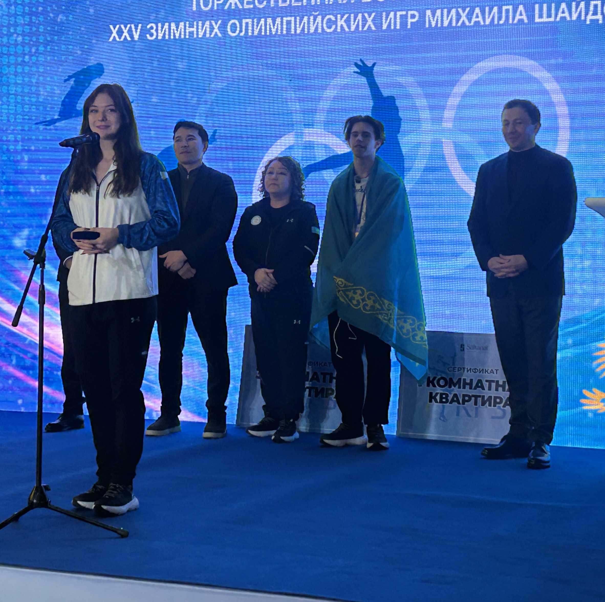 Одним из самых эмоциональных и неожиданных моментов вечера стало вручение сертификатов на квартиры. Для самих фигуристов и их наставников это оказалось настоящим сюрпризом. Подарки подготовил Казахстанский союз фигурного катания на коньках при поддержке спонсора — ювелирного дома Saltanat Diamond Gallery.