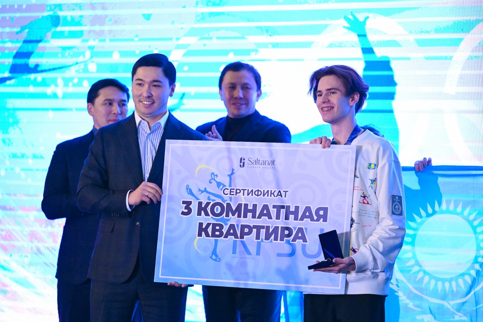 Одним из самых эмоциональных и неожиданных моментов вечера стало вручение сертификатов на квартиры. Для самих фигуристов и их наставников это оказалось настоящим сюрпризом. Подарки подготовил Казахстанский союз фигурного катания на коньках при поддержке спонсора — ювелирного дома Saltanat Diamond Gallery.