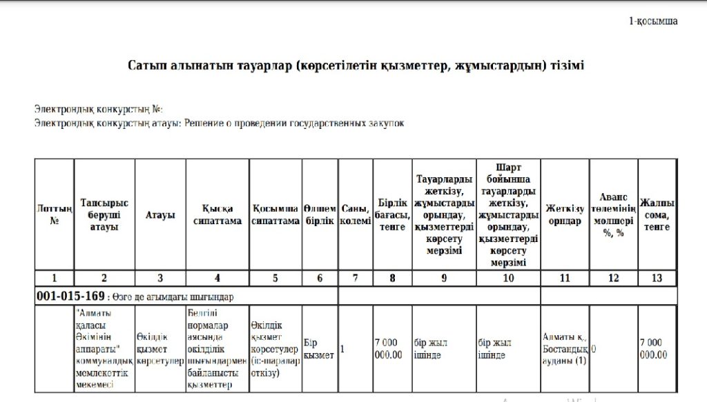 Келісімнің бастапқы сомасы 4 314 175 теңге болып бекітіліп, артынан қосымша келісім жасалып 7 000 000 теңгеге дейін арттырған.
