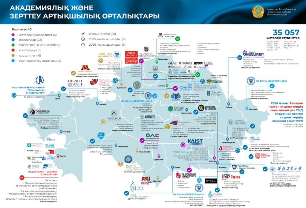 Бүгінде Қазақстан 40 жетекші шетелдік университетпен стратегиялық серіктестік орнатып, олардың 33 филиалы ел аумағында жұмыс істеп тұр. Бұл бастама бәсекеге қабілетті кадрлар даярлауға, ғылымды дамытуға және елдің жаһандық академиялық қауымдастыққа интеграциялануына негіз қалап отыр.