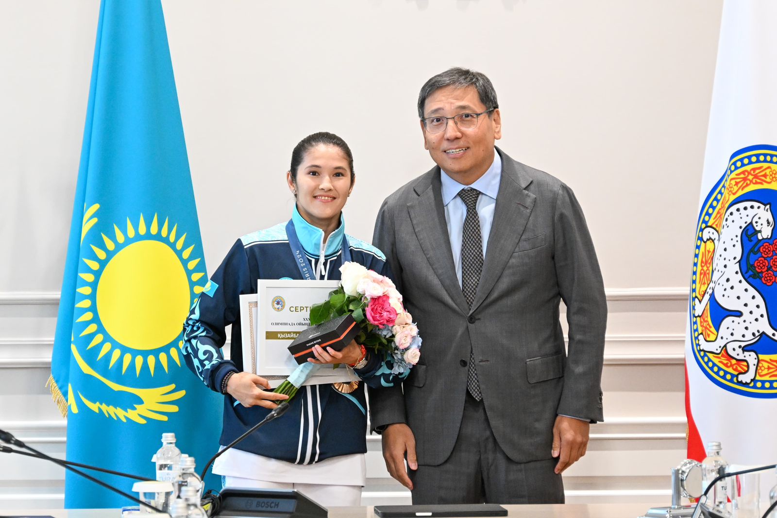 Шаһар басшысы спортшылар мен жаттықтырушыларды Олимпиаданың күміс жүлдегері – гимнаст Нариман Құрбановты, қола жүлдегерлер — дзюдошы Ғұсман Қырғызбаевты, боксшы Назым Қызайбайды және оқ атудан сайысқа түскен мергендер Александра Ле мен Ислам Сәтбаевты жетістіктерімен құттықтады.