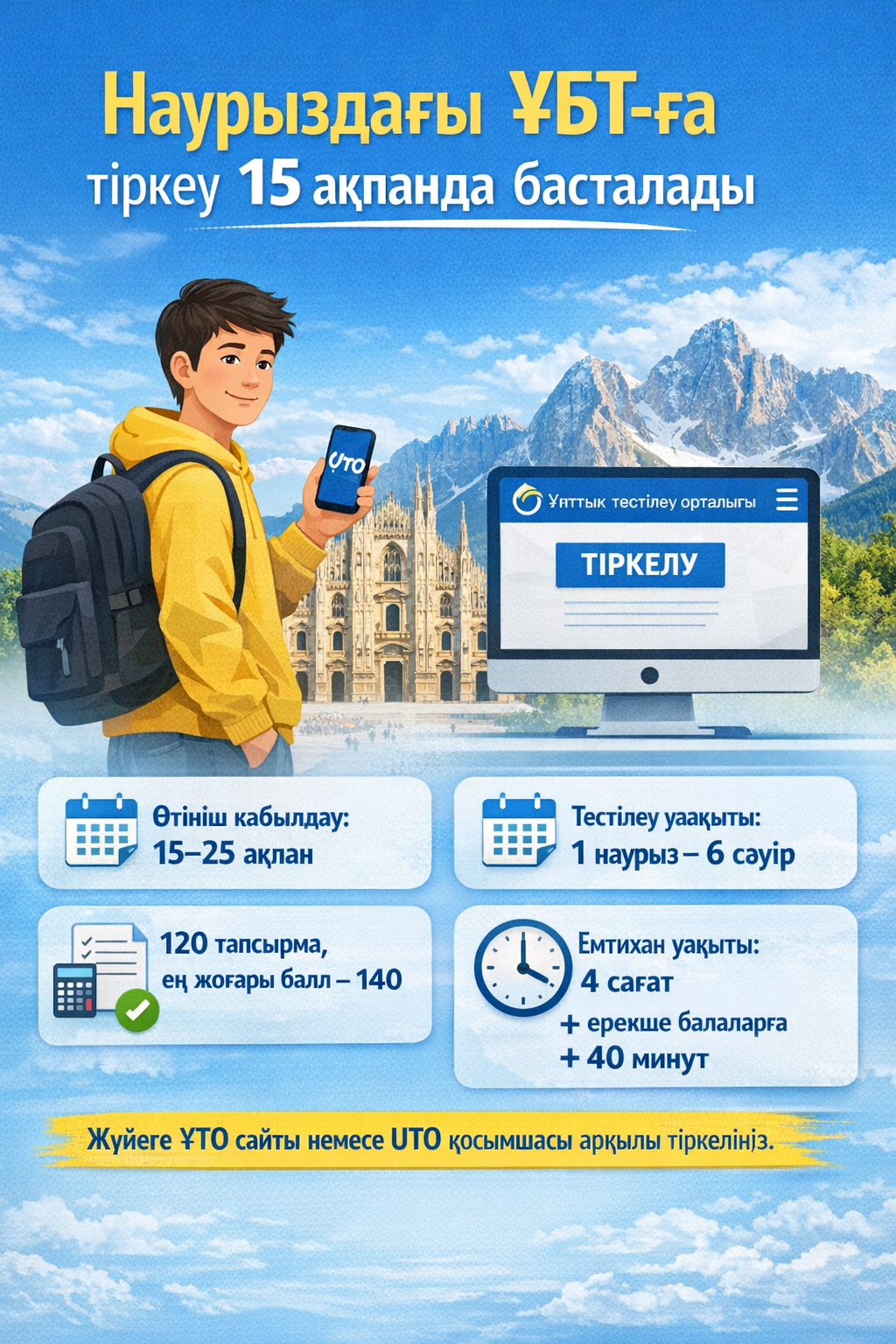 STEPPENEWS.KZ: Қазақстандық талапкерлерге наурыз айында өтетін Ұлттық бірыңғай тестілеуге (ҰБТ) тіркелу мерзімі басталатыны ескертілді. Ғылым және жоғары білім министрлігінің мәліметінше, өтініш қабылдау 15–25 ақпан аралығында жүргізіледі. Ал тестілеудің өзі 1 наурыз бен 6 сәуір аралығында өтеді.