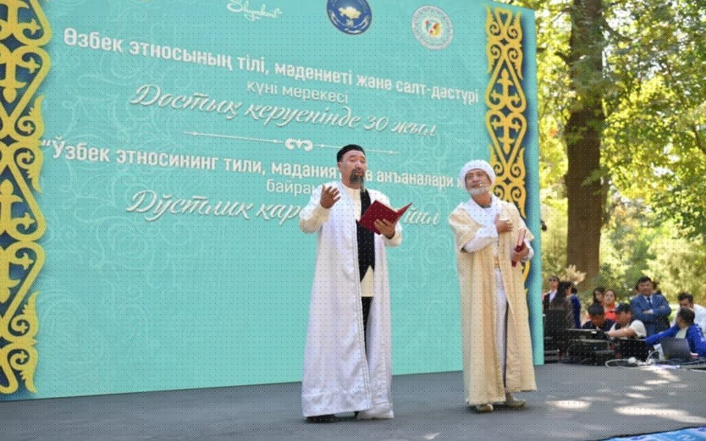 Концерттік бағдарлама Мемлекеттік Әнұранмен басталып, театр әртістерінің «Қош келдіңіз» композициясымен жалғасты. Мукими атындағы №13 мектептің «Бахор» би ансамблі өзбек халқының ұлттық «Шодлик» биін және қазақ биін тарту етті. Шымкент қалалық драма театры «Сары Жайлау» композициясын сахналап, көрерменнің ыстық ықыласына бөленсе, қалалық опера және балет театрының әншісі Нематилла Зикриллаев Төлеген Мұхамеджановтың «Отан» және А.Зацепиннің «Тыңда» әндерін орындап, мерекенің сәнін келтірді. Сондай-ақ театр әртісі Шахиста Усманова өзбек халқының әсем әуені – «Мустахзод» әнін шырқады.