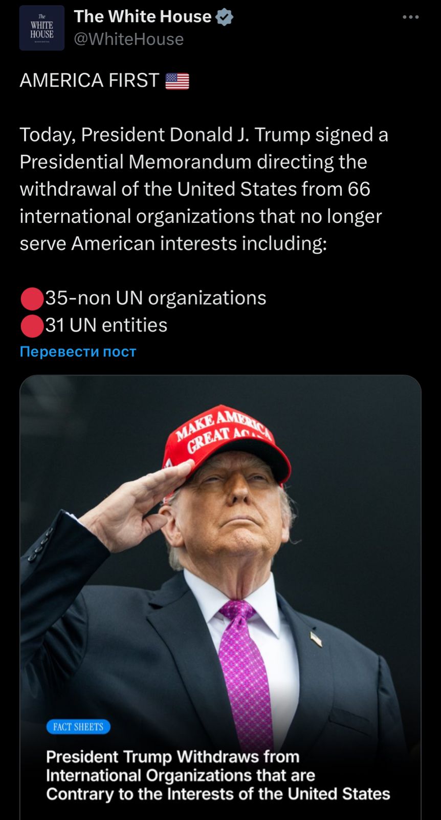 STEPPENEWS.KZ: АҚШ президенті Дональд Трамп елдің 66 халықаралық ұйымнан шығуын көздейтін меморандумға қол қойды. Олардың қатарында Біріккен Ұлттар Ұйымының құрылымдары да бар. Ақ үй әкімшілігінің бағалауынша, аталған ұйымдардағы мүшелік АҚШ-тың ұлттық мүдделеріне қайшы келеді.