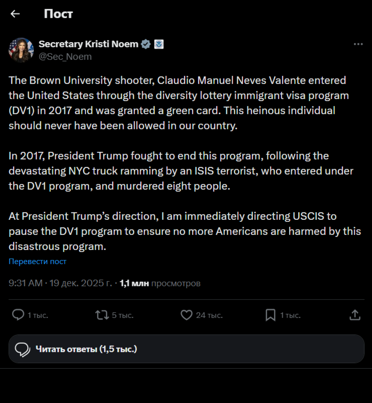 — Президент Дональд Трамптың тапсырмасы бойынша мен АҚШ Азаматтық және иммиграциялық қызметіне DV бағдарламасын дереу тоқтатуды жүктедім. Мұндай қайғылы салдары бар бағдарламадан америкалықтар бұдан былай зардап шекпеуі керек, — деді Кристи Ноэм
