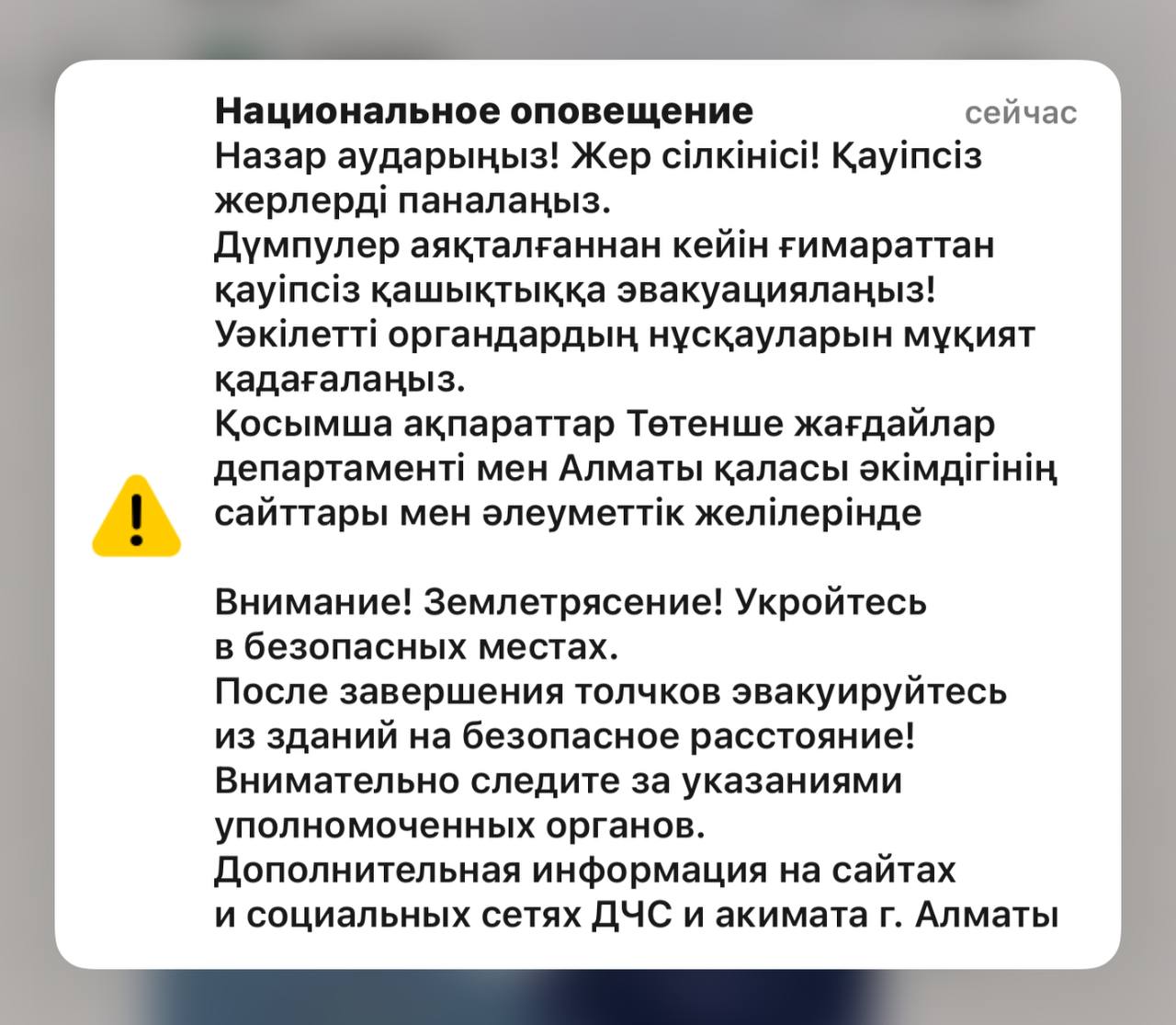 В Департаменте по чрезвычайным ситуациям сообщили, что уведомление о землетрясении было отправлено автоматически. Сообщение пришло корректно — это не ошибка, а часть работы системы в тестово-боевом режиме.