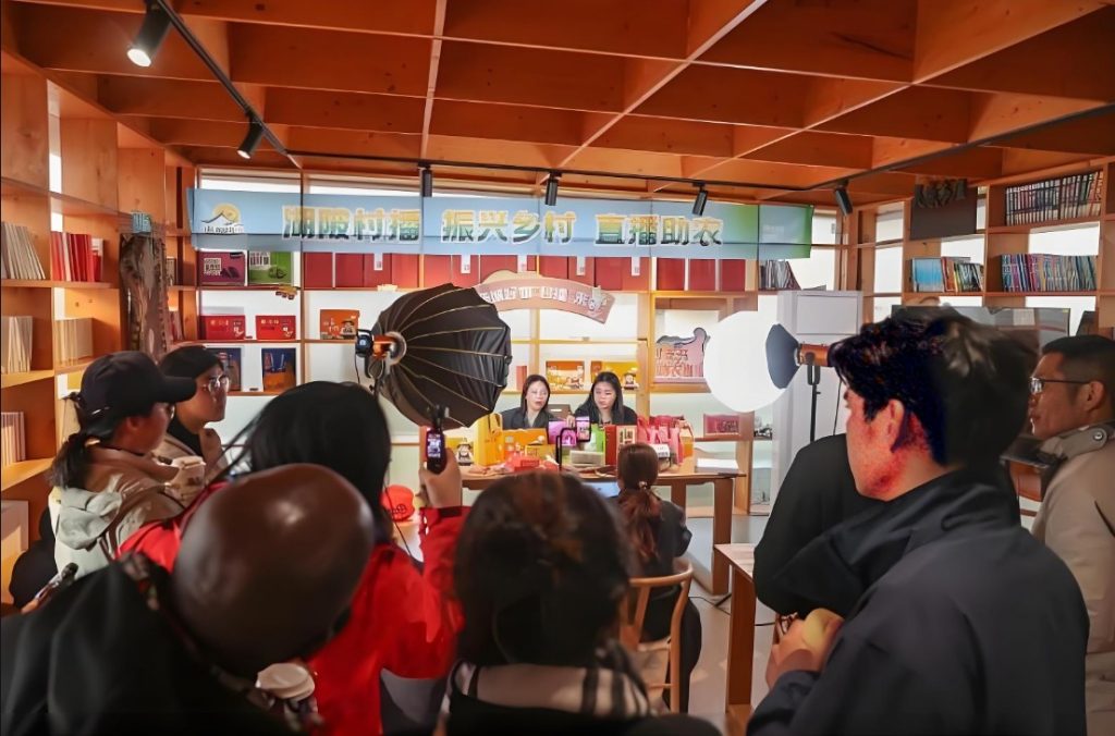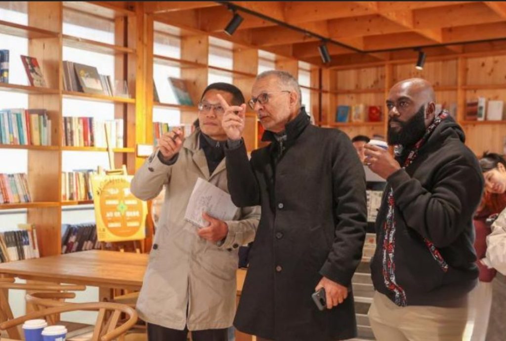На фото иностранные и китайские гости посещают и исследуют книжный дом «Вдохновение» в деревне Хупэй и наблюдают сельскохозяйственный стриминг в книжном доме в деревне Хупэй.