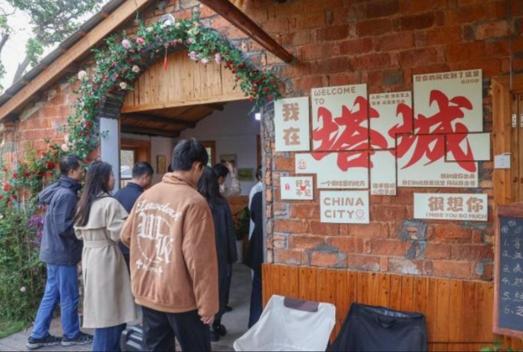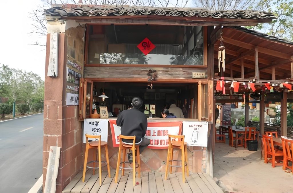 На фото туристы пьют кофе на станции «Счастье» в деревне Хупэй, это сельское кафе, созданное путём реконструкции старого дома.