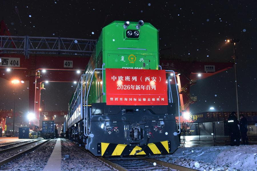 Со станции Международного порта Сиань в четверг отправился первый в 2026 году поезд по маршруту Китай—Европа. Железнодорожный состав следует по Транскаспийскому международному транспортному маршруту (ТМТМ): через КПП Хоргос он пересечёт границу с Казахстаном, далее проследует по территории республики, через Каспийское море и прибудет в Баку — столицу Азербайджана.