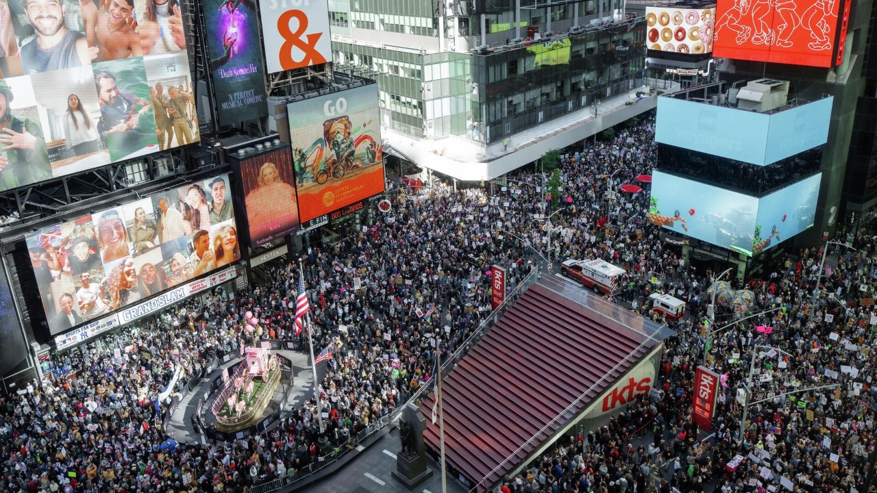 Сотни человек собрались на Таймс-сквер в Нью-Йорке, чтобы выразить протест против военной операции США и Израиля в Иране, сообщает РИА Новости.