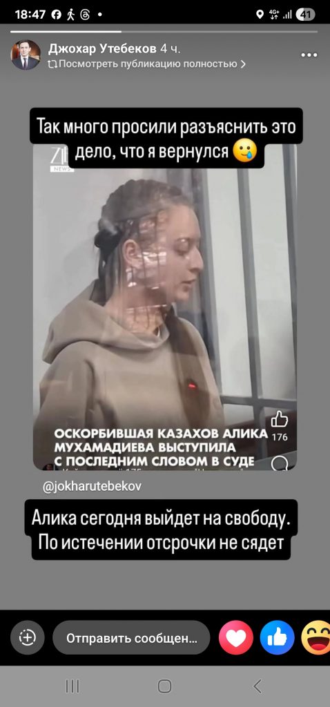 В свою очередь, известный казахстанский адвокат Джохар Утебеков на своей странице в Facebook выразил сомнение, что Алика Мухамадиева после 2 лет отсрочки сядет в тюрьму.