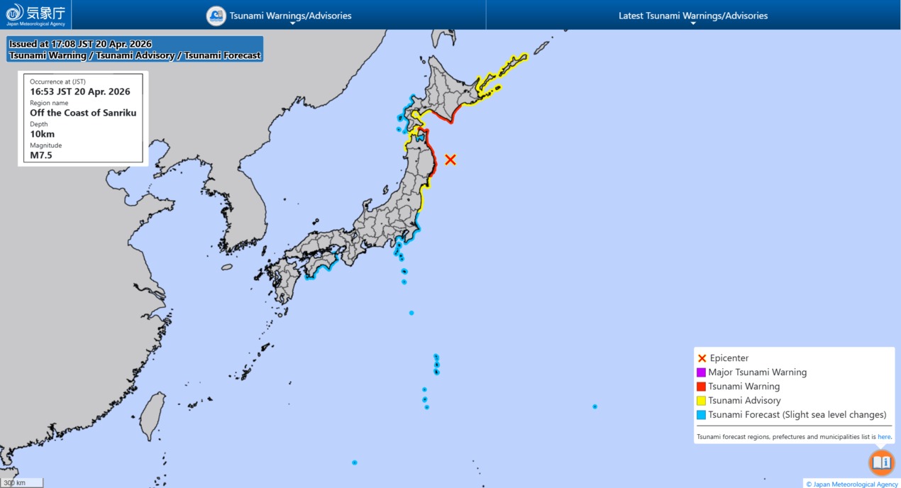 В северо-восточных и северных регионах Японии в понедельник произошло сильное землетрясение предварительной магнитудой 7,5. После подземных толчков власти объявили предупреждение о возможном цунами, сообщает SteppeNews.kz со ссылкой на Kyodo.
