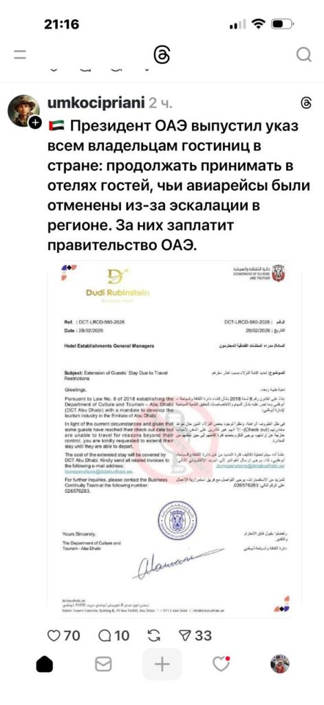 Власти Дубай направили гостиницам официальные инструкции в связи с текущей ситуацией и перебоями в транспортном сообщении.