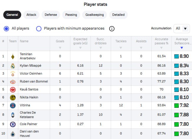 Вратарь «Кайрата» Анарбеков неожиданно возглавил обновлённый рейтинг авторитетного портала SofaScore, опередив мировую звезду Килиана Мбаппе. Рейтинг был сформирован на основе статистических показателей игроков после шестого тура общего этапа Лиги чемпионов УЕФА сезона-2025/26.