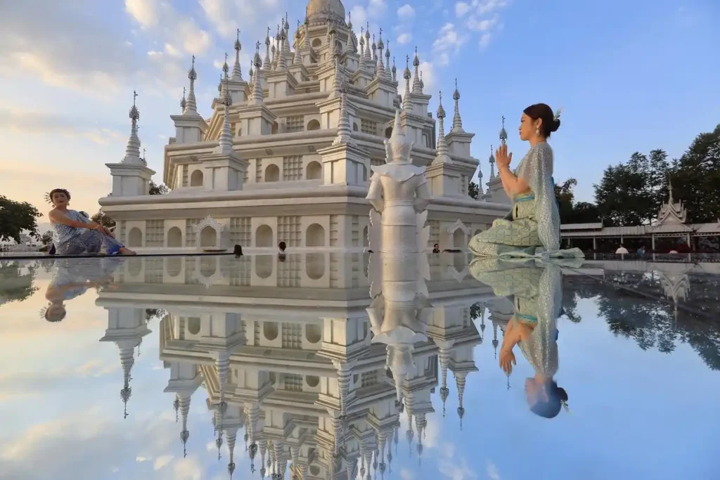 Лучшее место для фотосъёмки с Серебряной пагодой — фотозона «Небесное зеркало». Спокойная вода отражает величественную Серебряную пагоду, голубое небо и белые облака, а в сочетании с очаровательными народными костюмами дай атмосфера сразу же становится ещё ярче.