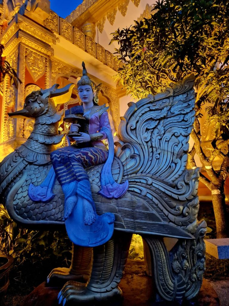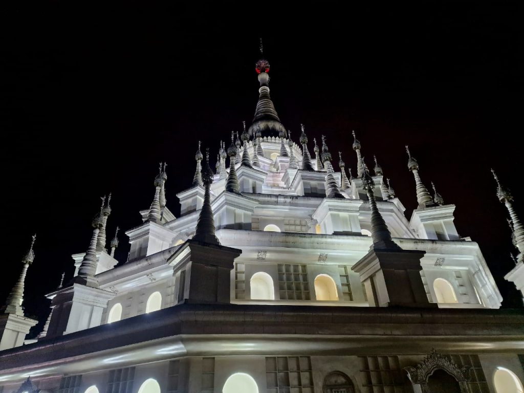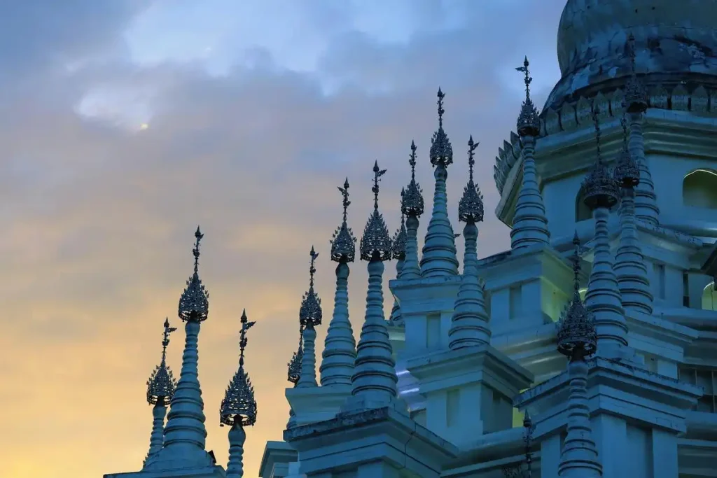 Вечер — самое красивое время суток для Серебряной пагоды. В это время заходящее солнце освещает пагоду тёплыми золотистыми лучами, омывая её мягким сиянием. Вся пагода ярко сияет в лучах заката, выглядя величественно и элегантно.