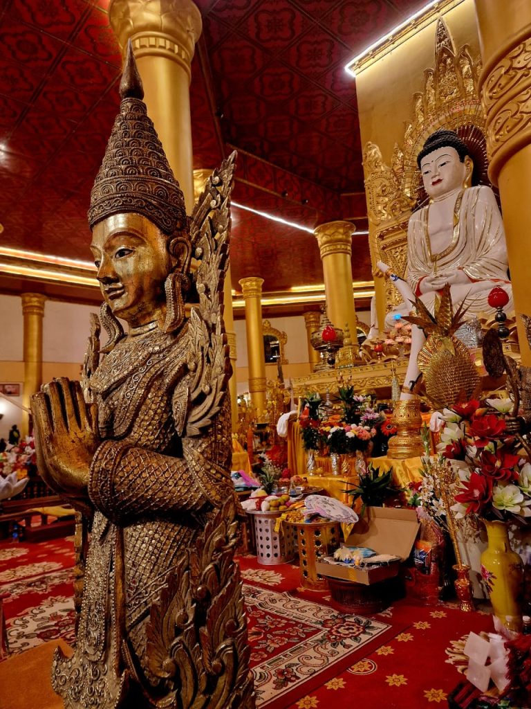 На фоне ясного голубого неба золотая башня ярко сияет в солнечных лучах, ее величественный вид напоминает храм, спустившийся с небес. Чем ближе вы подходите, тем сильнее ощущаете впечатляющее величие пагоды. Основная пагода состоит из восьми пагод меньшего размера и ещё 16 на внешней платформе. Пагоду окружает множество божеств-хранителей, как лежащих, так и стоящих.