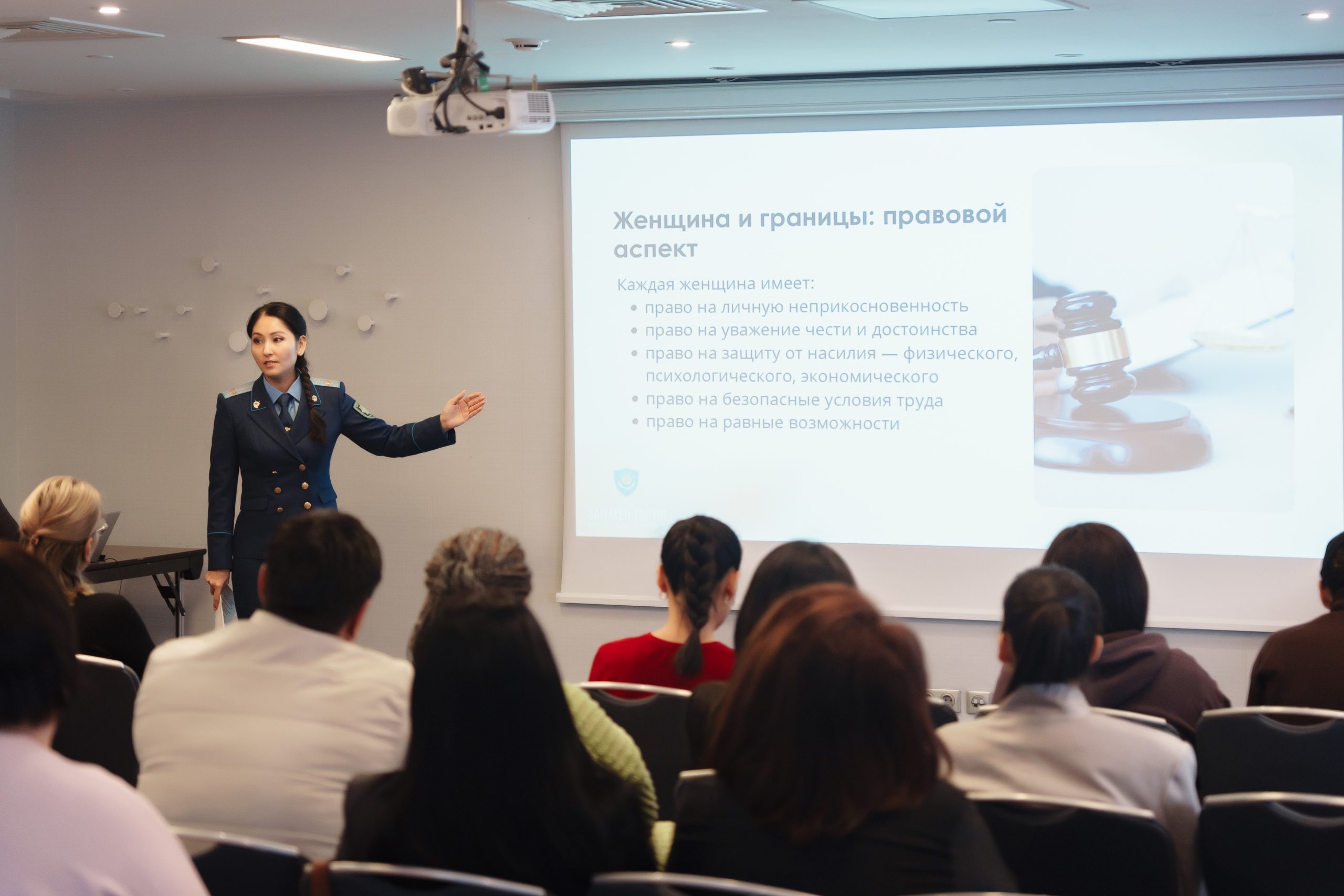 Спикером выступила юрист, прокурор и государственный обвинитель Айжан Аймаганова, которая провела открытую экспертную сессию и разобрала реальные ситуации, с которыми женщины сталкиваются в личной жизни и профессиональной среде.
